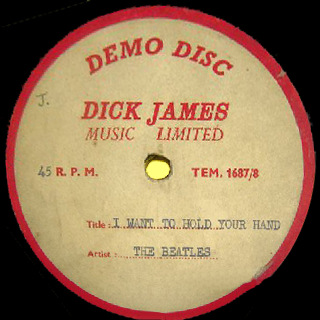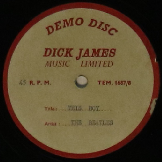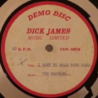 Auction Description - 2017I WANT TO HOLD YOUR HAND/THIS BOY DICK JAMES ACETATE - An extremely rare original 'Dick James Music Limited' 7" acetate Demo Disc, an extremely early 1963 recording (TEM 1687/8). The playing surface, always exceedingly tricky to grade, is in G+ condition. There are surface marks and some wear to the lacquer, though this is never heavy or excessive. Obviously not made to be played extensively, the next owner of this piece of Beatles history could certainly play the record through without major playback issues. Issued with red text on cream labels with the track titles in blue. Some scuffing to the labels, this is not excessive. Issued with a cardboard sleeve with 'Sotheby's Belgravia 804762' sticker indicating that the record may have been purchased from one of their auctions. A sample of the recordings will be made available prior to the auction.