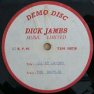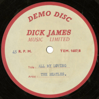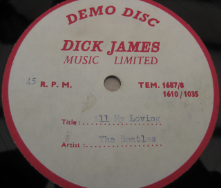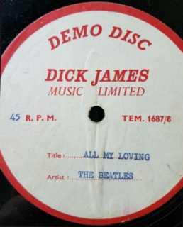 2021-23 - Auction/Sale InfoAn original Dick James Music Ltd. 7-inch acetate for The Beatles 1963 song 'All My Loving'. On the white and red Dick James Demo Disc label with printed artist and title details. It comes in a plain brown sleeve. The record skips at the start of the track. There are several light surface marks over the vinyl. The condition of the acetate is very good minus. |