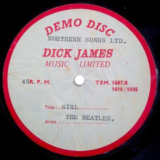 An original single sided 7 inch Dick James Music acetate for the Beatles song entitled ‘Girl'. The song appeared on the 1965 album ‘Rubber Soul'. The song title ‘Girl', ‘The Beatles' and the record speed ‘45' have been typed onto the label. It comes in a plain white sleeve. There are some light surface marks over the vinyl. Visually the condition is very good but the record plays though in excellent condition. |