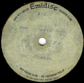 Auction Description - 2004Before you is the Beatle's rare 45 EMIDISC white label acetate "And I Love Her." it's in extremely good condition considering the time it played in history. I have played the acetate just once and the sound is impeccable. The flip side is not labeled.[sic] The acetate was acquired at Christie's auction house in London. Christie's auction stamp is at the top right corner. This was part of John Lennon's collection. It was sold from Cynthia Lennon's estate. Documents from Christie's auction house to accompany sale. The acetate has been in my collection since 1991. A great piece to enhance anyone's collection of Beatle's memorabilia. Rating: Extremely good. Light surface scratches, no gorges, no cracks, no chips, no warping. Auction Description - 1991A single-sided acetate And I Love Her , Emidisc white label inscribed in Geoff Emerick's hand, 1964. |
