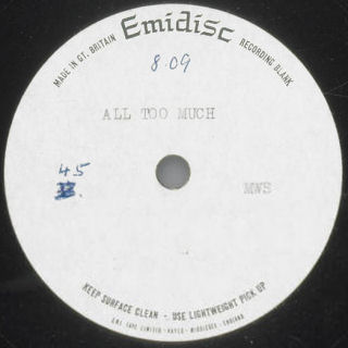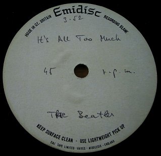 1967, Emidsc white label, typed ALL TOO MUCH MWS, handwritten 8.09 45, the working title being It’s All Too Much, the single sided 12 inch acetate contains an unreleased version of the song with an extra verse and longer fade out.