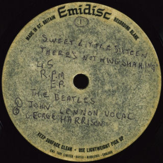 the double-sided, 7 inch 45 Emidisc with handwritten recording details, the tracks listed as 'Sweet Little Sixteen'/'There's Nothing Shaking'/'So How Come No One Loves Me'/'Kansas City' Sold for £480 inc. premium