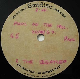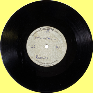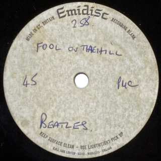 2022 - Auction Info - Lot 111THE BEATLES - FOOL ON THE HILL - ORIGINAL UK 7" EMIDISC RECORDING. Quite wonderful to see original UK single-sided 7" Emidisc acetate recording of Fool On The Hill. With printed 'Made In Gt. Britain Emidisc' label with the artist and song information handwritten, the non-playing side with no label or additional information. The acetate is in very sharp VG+ condition showing only a few rather light surface marks to the playing surface, these at no point are heavier in nature with absolutely no feelable scratches. Nice and clean label with a little wear. Without any deterioration to the aluminium lacquer. Housed with a clean original Parlophone company sleeve. We believe the recording is the same as the commercial release |
