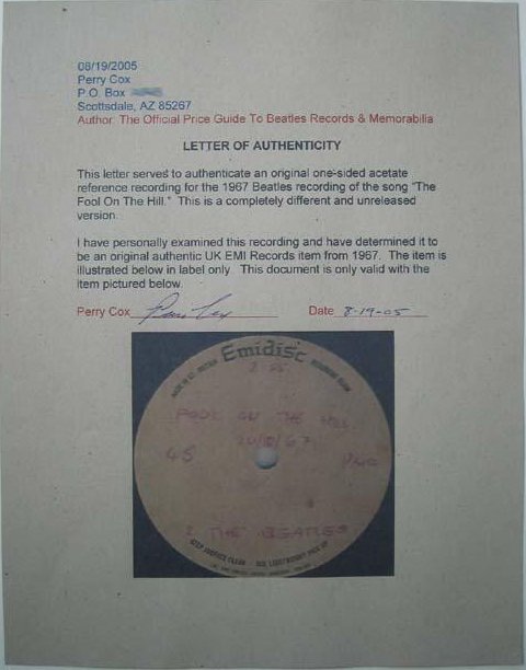 of authenticity from Perry Cox, world famous Beatles expert and author of