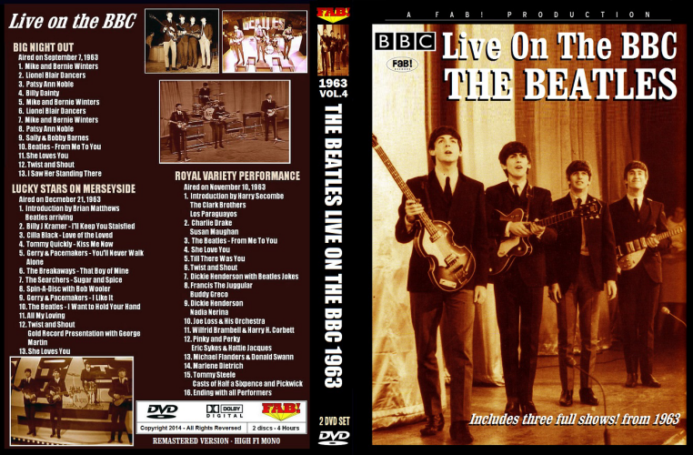 BEATLES LIVE ON THE BBC 1963 2 DVDS 2 DVDS - 4 hours total complete uncut shows, original mixes! No time codes, except on Royal Variety Show - all in chapters! Now remastered so all is in black and white - not alternate colors and crisper and new transfers! Been wanting to do this for a while and now its done! Audio all corrected too! Quality is excellent, however only Very Good on Big Night Out...... but nevertheless the best there is! VIDEO SAMPLE: Courtesey of ' FAB GEAR FAVE RAVE ' |