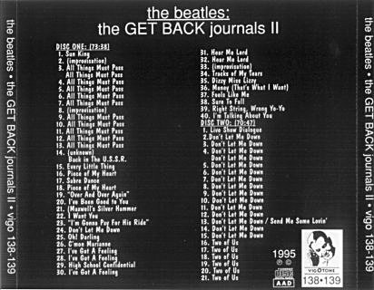"features a great deal of previously unheard "All Things Must Pass" rehearsals, which includes George's "you're so full of shit" comment to Paul (which is clearly not the "punky put on" that Beatle history has painted it to be). Certainly the highlight of this disc is a lengthy oldies jam session from January 6th, featuring never-before-heard performances of "Sure To Fall" and "Right String, Wrong Yo-Yo".